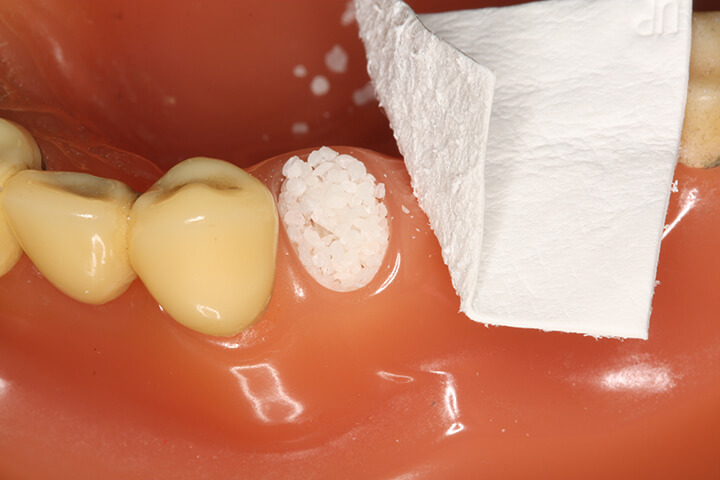 In socket grafting, particulates of bone are placed in a fresh extraction site and covered with a thin “tarp-like” biologic membrane. The site is left to mature, allowing for proper healing and a stronger bony foundation, prior to implant placement.