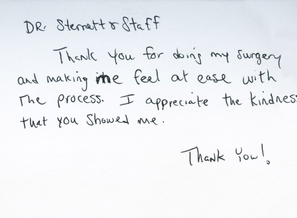 Thank you for doing my surgery and making me feel at ease with the process. I appreciate the kindness that you showed me.